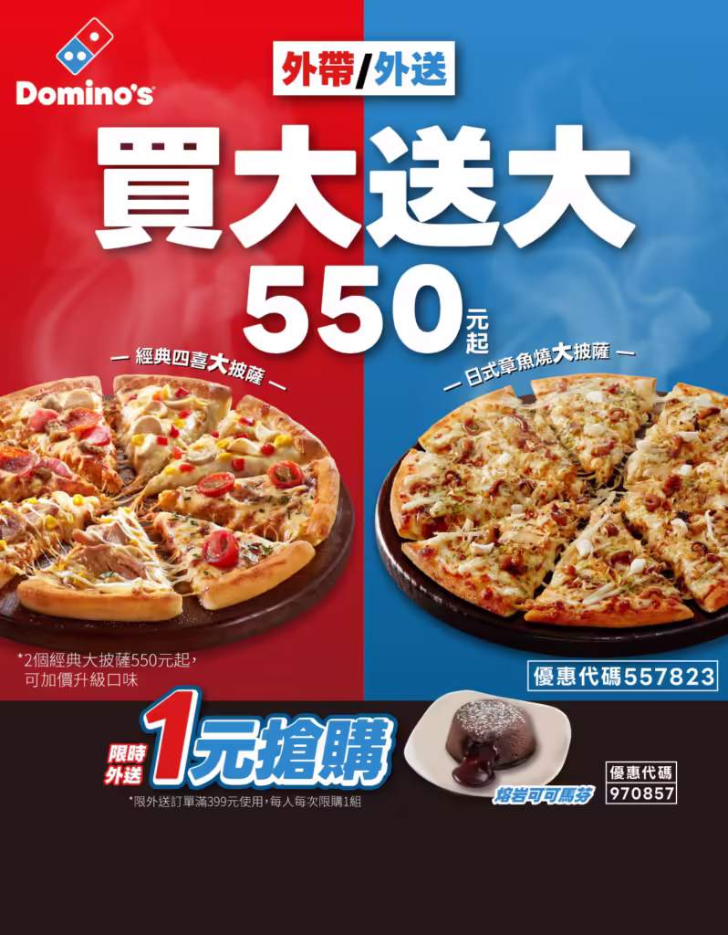 • 🔥 大披薩外帶5折: 章魚燒披薩、小披薩最低只要$159起!